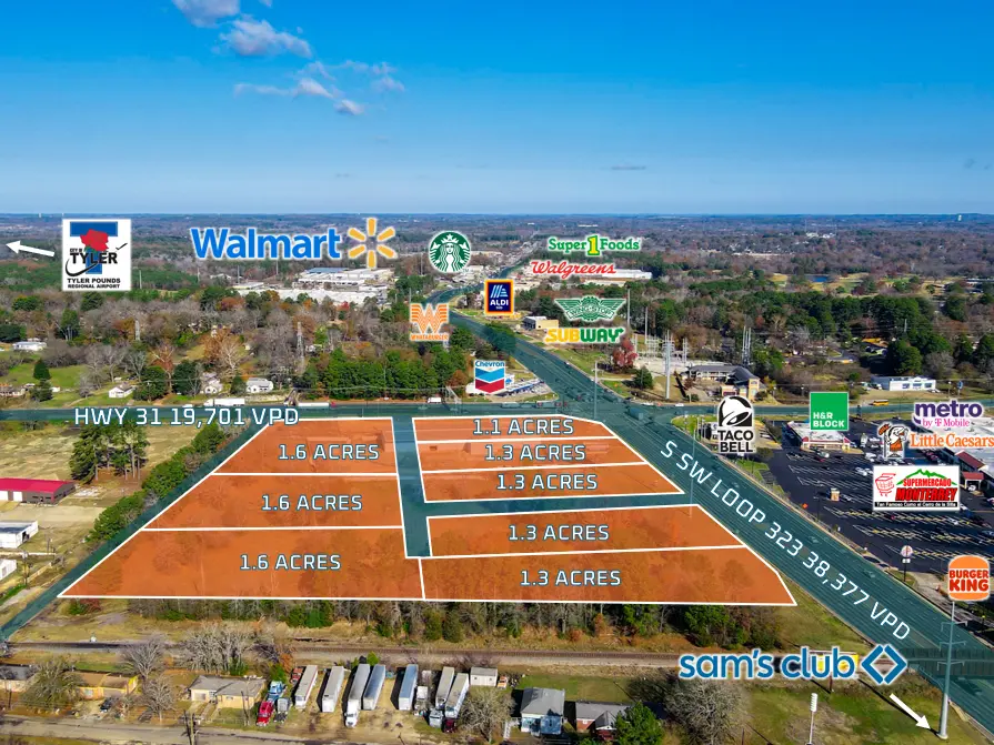 Located on the West Loop 323, under development and pad site sales. Corner lot with 58,078 VPD. 1-acre sites for sale or ground lease. This area of Tyler is seeing tremendous growth and investment with nearby national retailers, large employers, and neighborhoods. Please call for more details.